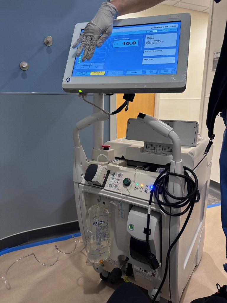 I have been feeling good! My body feels good and energy is back, my taste is still WAY off but I don’t think that will change till this is over. Last week I battled conjunctivitis and dry eye but we have that under control. Yesterday I went and had my PET scan. I took a picture of the machine for you all. It was crazy, they hook this huge machine up to your IV and it mixes the radioactive med that goes into you. The test was uneventful, but then he told me I shouldn’t be in close contact with small children or pregnant women for 24 hours. OH and you should drink a lot of water. OH OK, so that radioactive, yup I drank LOTS of water to get that stuff out of my system!!